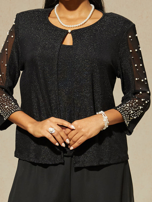 Beaded 3/4 Sleeve Metallic Knit Blouse