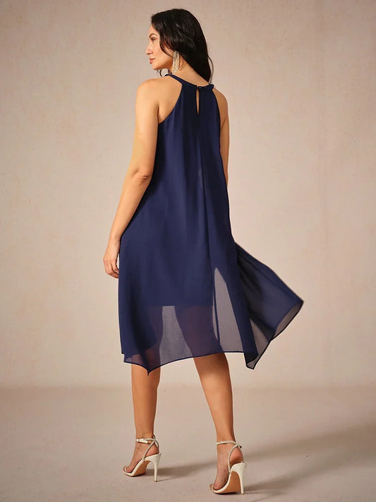 Chiffon Solid Sleeveless Halter Neck Navy Blue Dress