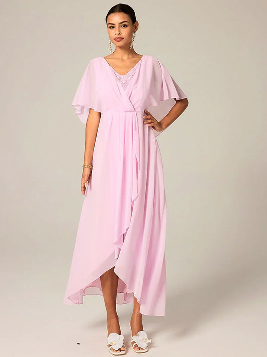 Asymmetrical Ruffle V Neck Blush Pink Maxi Dress