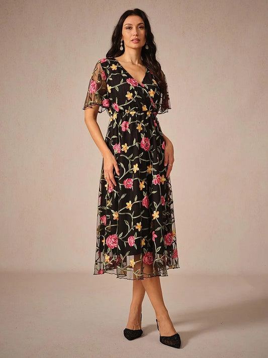 Floral Cowl Neck Tea-Length Dress with Flounce Hem