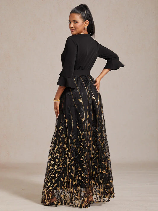 Embroidered Sequin Empire Waist Gown with Flutter Sleeves