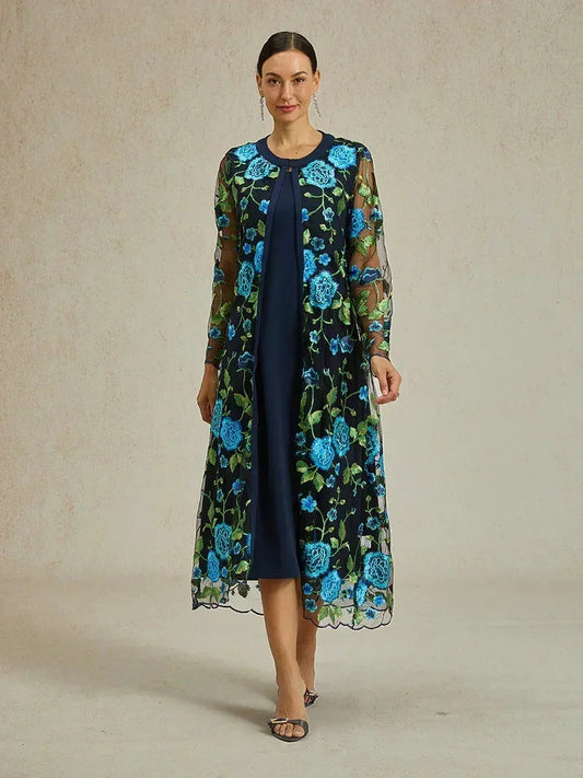 Chiffon Mesh Lace Embroidered Ruffle Floral Two Piece Dress