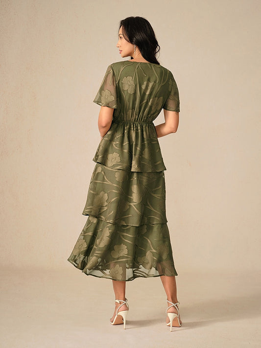 Chiffon Lace V Neck Short Sleeve Flared Midi Dress