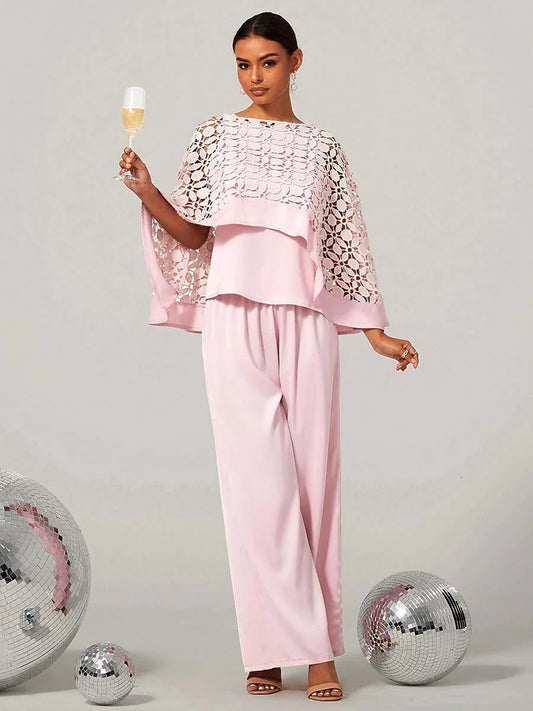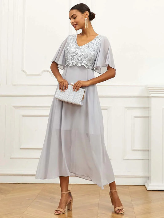 Gray Pink Lace Patchwork Chiffon Midi Dress