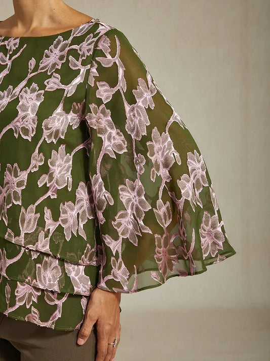 Floral Chiffon Boat Neck Blouse with A-Line Sleeves