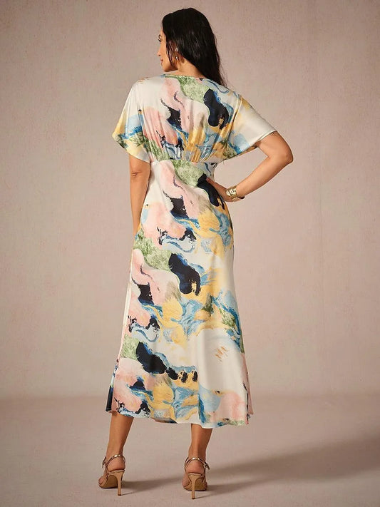 Floral Cowl Neck Tea-Length Dress with Flounce Hem
