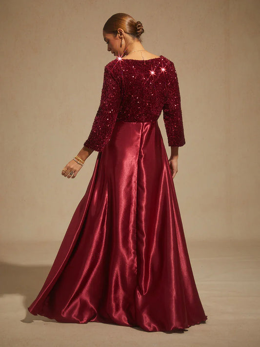 Long Stretch Velvet Evening Dress with 3/4 Sleeves
