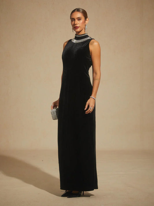Black Maxi Evening Dress with Snowflake Crystal Embellishments