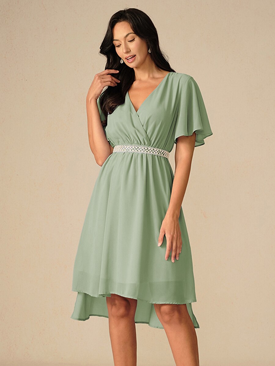 This charming A-line dress in a delicate pastel blue hue is perfect for spring and summer events. Featuring a flattering V-neckline and flutter sleeves, it exudes romantic elegance. The elastic waist ensures a comfortable and flexible fit, while the lightweight chiffon fabric provides breathability and a graceful drape. Ideal for weddings, garden parties, or cocktail events, this dress offers effortless sophistication. (Belt not included.)