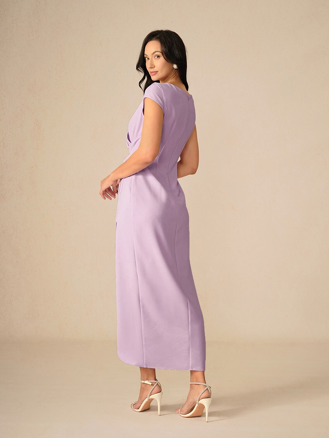 This sophisticated wrap dress in a soft dusty rose hue features a flattering V-neckline and cap sleeves for a touch of elegance. The cinched waist enhances the silhouette, while the fabric provides comfort and ease of movement. Designed for versatility, this dress is perfect for formal events or evening gatherings, offering a timeless yet modern look.