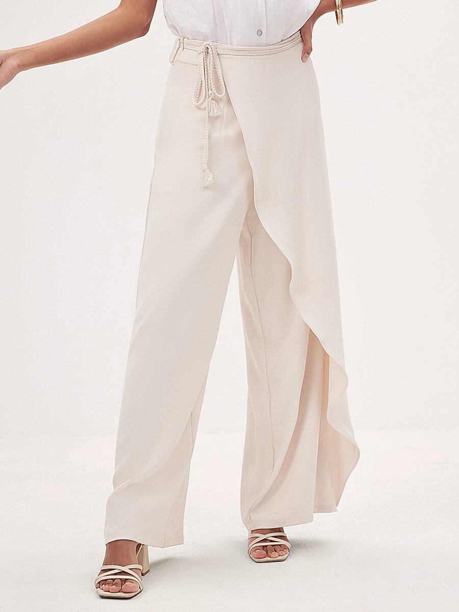 Design: Asymmetrical mid-waist with wide-leg silhouette, featuring side pockets for practicality and style.Removable belt.