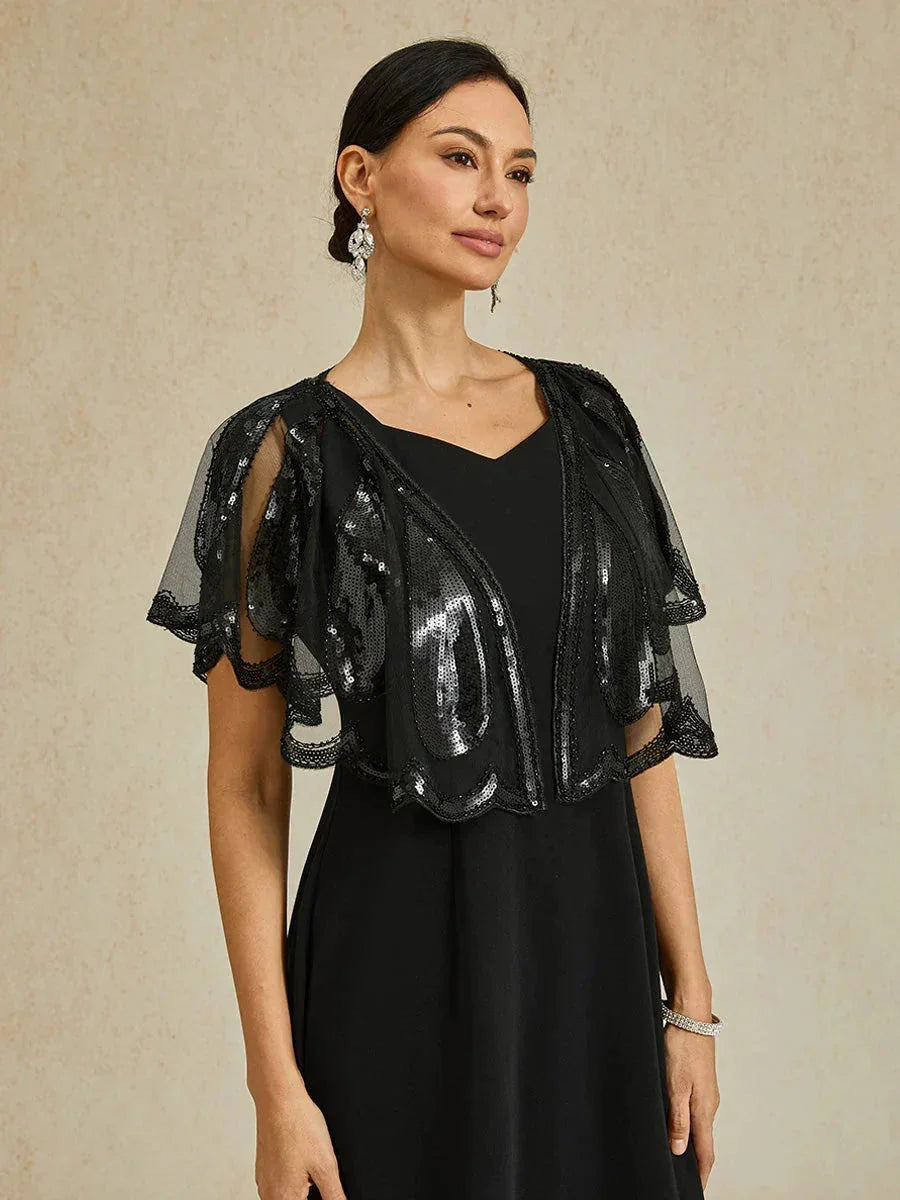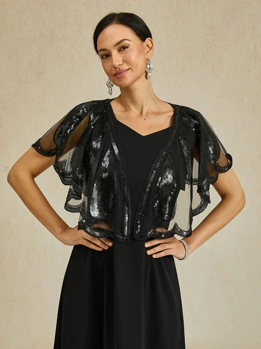 Design: Open-front wrap cape, sleeveless coverage, vintage Gatsby style, beaded and sequin embroidery, one-size fits most