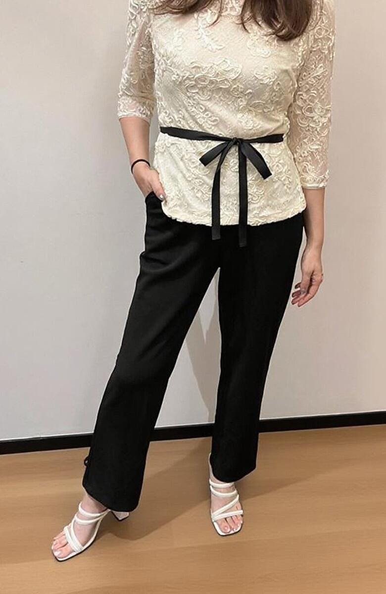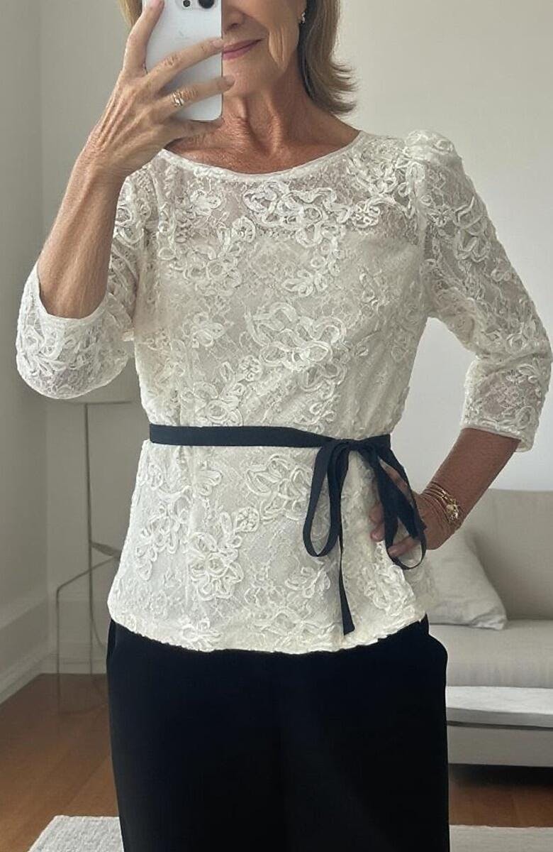 This elegant 3/4 sleeve blouse is crafted from luxurious embroidered lace, perfect for Fall and Winter. Featuring puff shoulder sleeve details, an illusion neckline, and a flattering satin tie belt, it combines sophistication with comfort. Pair it with our black pants or black skirt for a chic evening look, ideal for formal dinners, cocktail parties, or holiday gatherings.