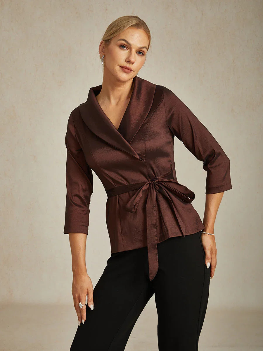 3/4 Sleeve Stretch Taffeta Blouse with Tie Waist Detail