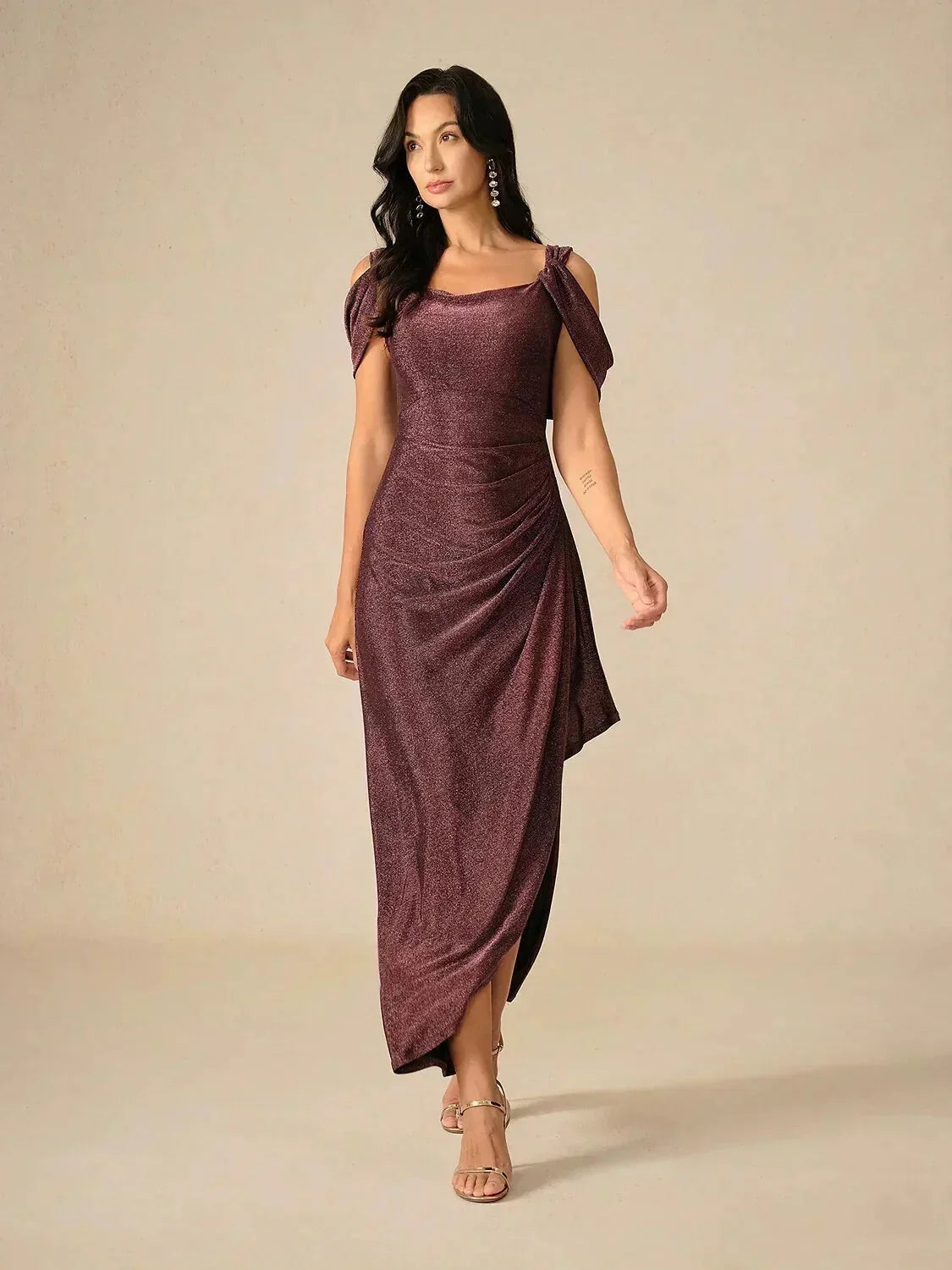 - Design: Cold shoulder sleeves, draped skirt silhouette, cowl neckline, flattering waistline, floor-length hem