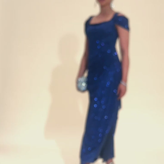 Turn heads in this stunning ankle-length glitter mesh dress. Designed with cold shoulder sleeves and a graceful cowl neckline, the soft draped silhouette flatters your figure while adding elegant movement. A perfect choice for formal occasions, weddings, or special celebrations.This product will have a slight flash phenomenon. After receiving it, you can shake off the surface flash or spray it on the surface of the clothes with a styling spray.