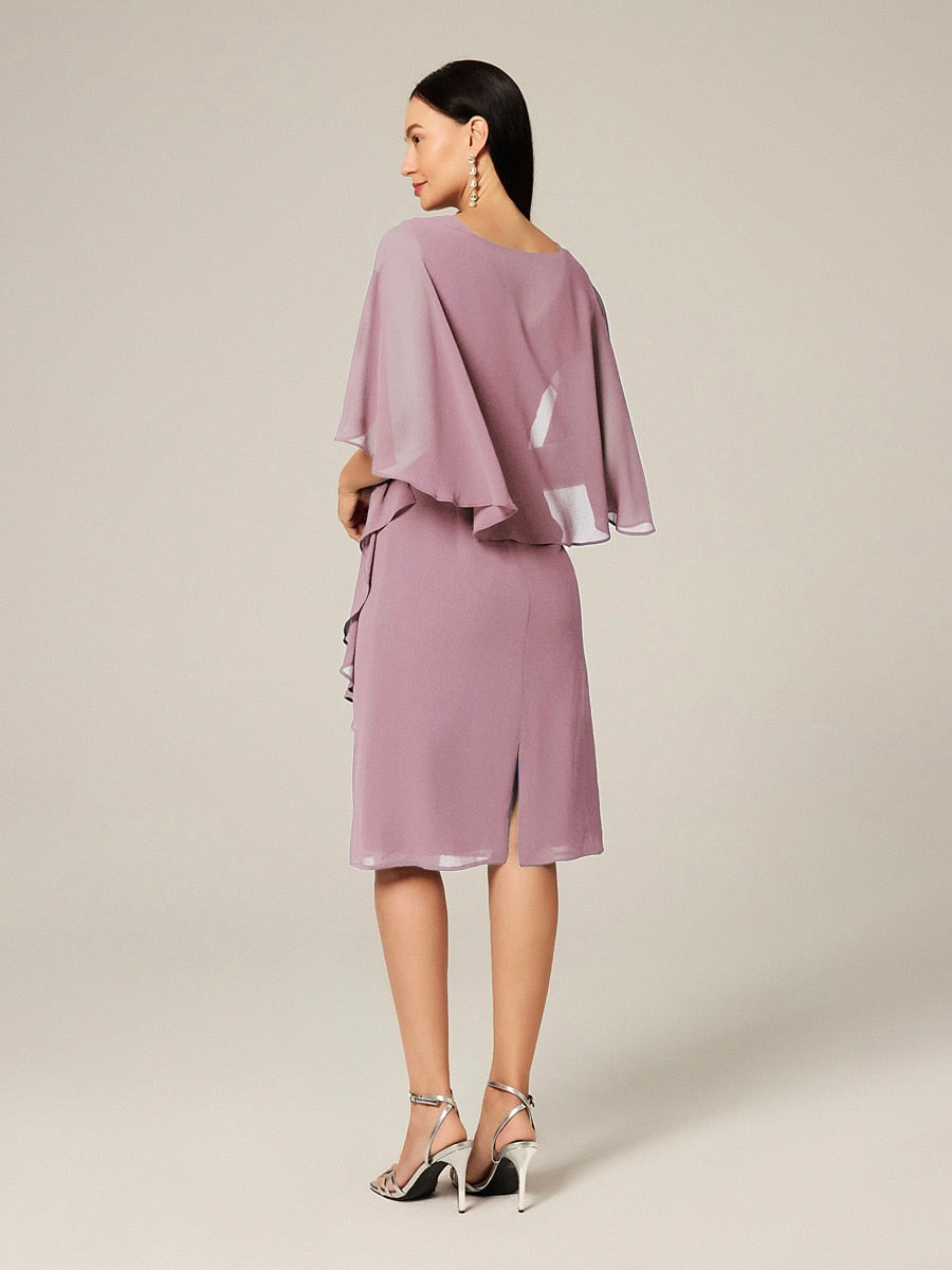 Asymmetrical Boat Neck Ruffled Chiffon Cape Dress