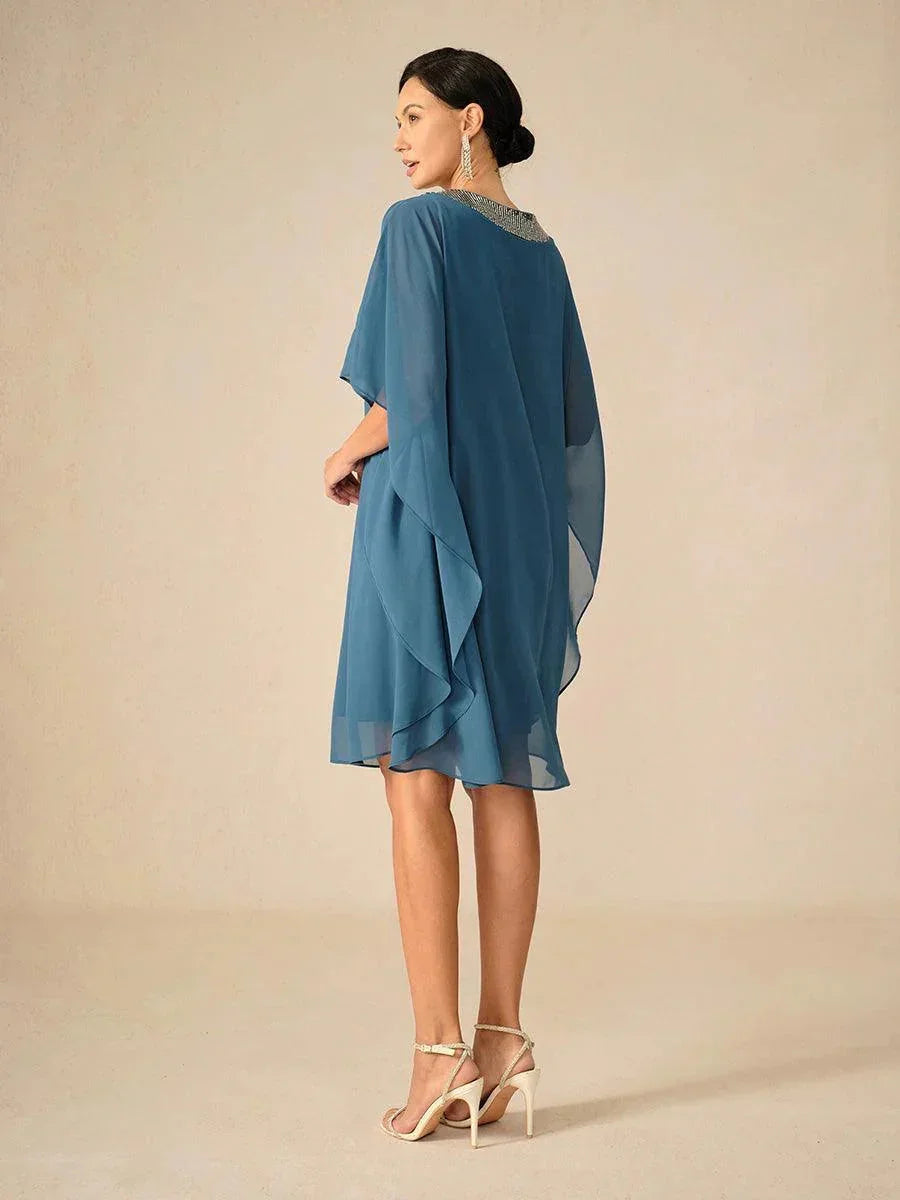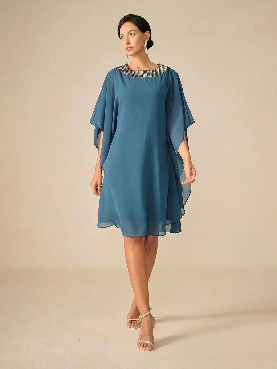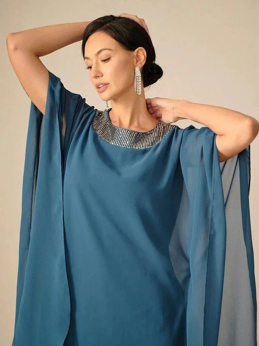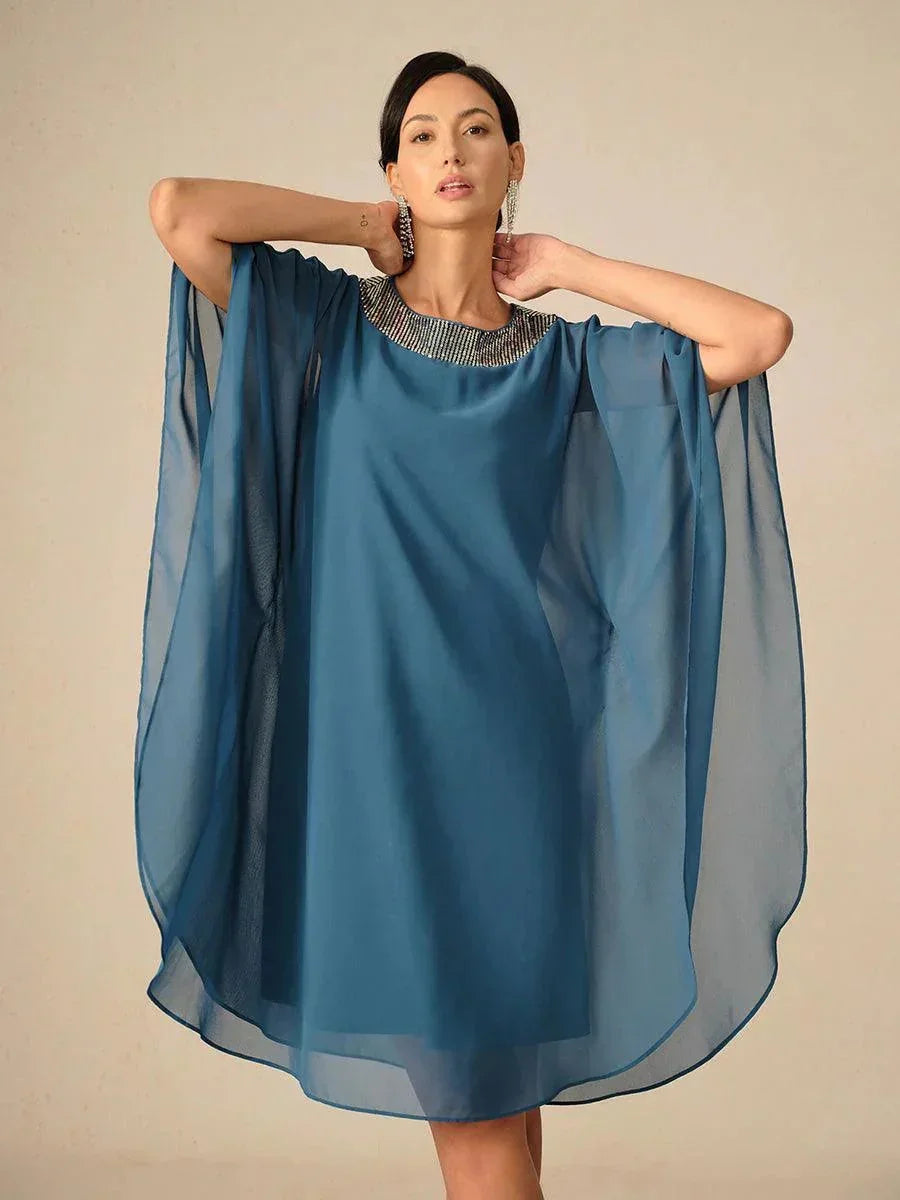 This elegant chiffon cape dress features a graceful batwing sleeve design and a loose, flowing silhouette that flatters all body shapes. The round neckline is delicately embellished with shimmering beads, adding a touch of glamour. Made from lightweight, sheer chiffon, this dress offers comfort and sophistication for spring and summer. Perfect for formal events, cocktail parties, or evening occasions, and available in inclusive sizing for mature women.