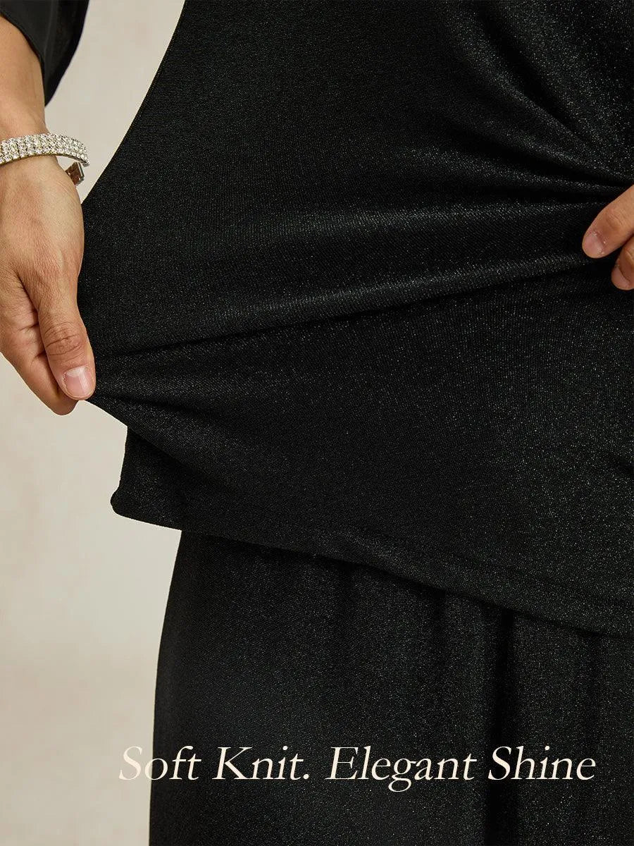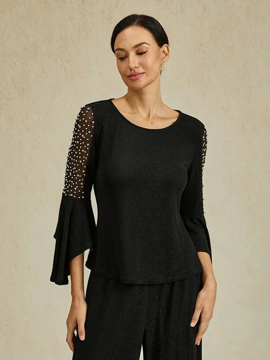 Shimmer with ease in this beautifully tailored blouse crafted from ultra-soft metallic knit. The high-stretch fabric provides a flattering, body-inclusive fit, while the sheer mesh detail on the upper arms adds an elegant illusion accented with beads. Designed for both comfort and polish, this blouse is perfect for elevating your evening or smart casual wardrobe.
