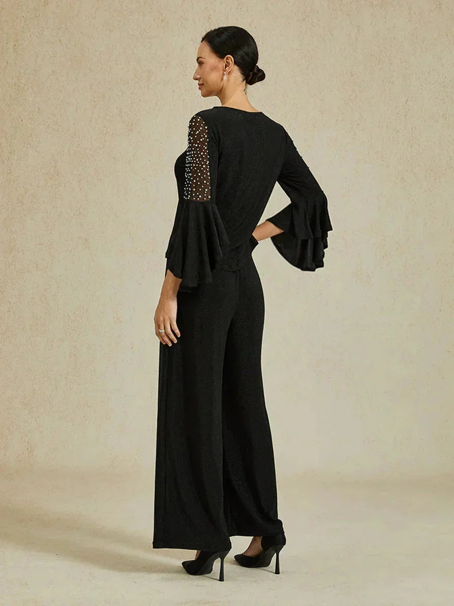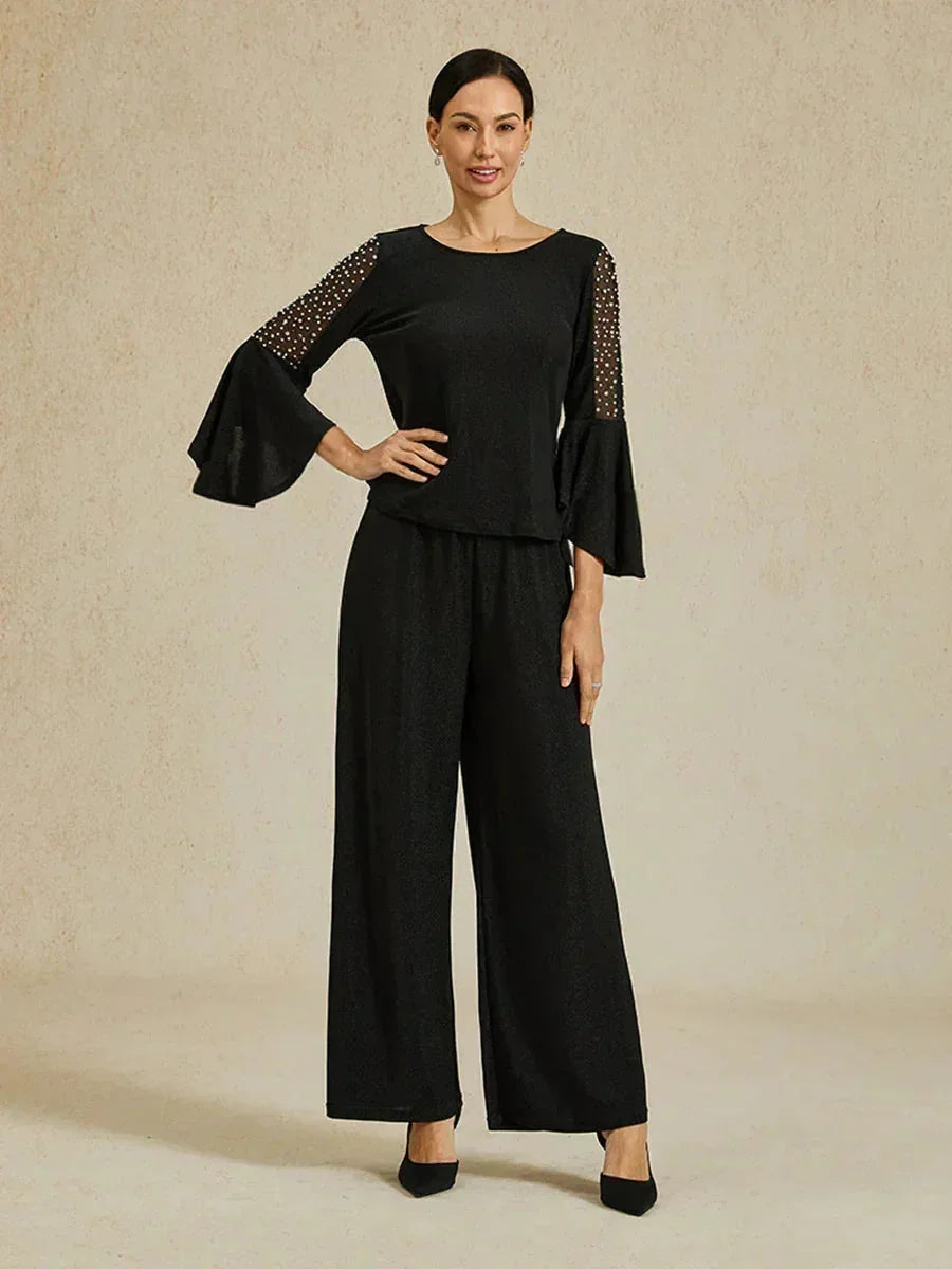 Beaded detail, 3/4 sleeve length, stretch knit fabric, shimmering finish