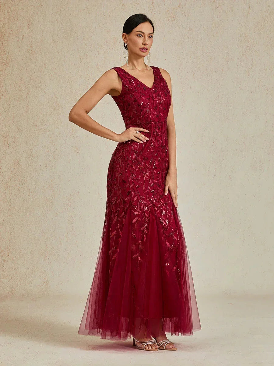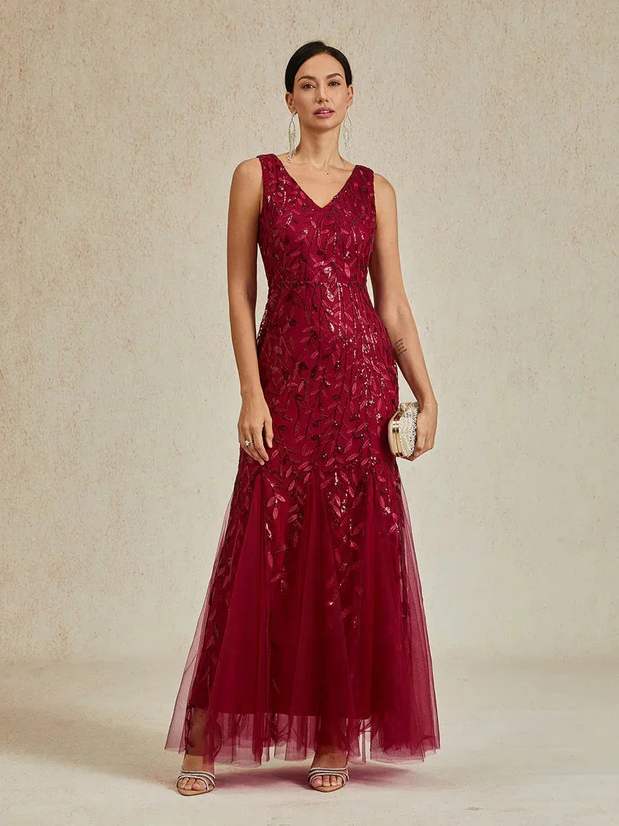 Gracefully tailored to enhance your natural curves, this sleeveless V-neck mermaid gown features intricate bead and sequin embroidery throughout in a delicate leaf motif. The figure-hugging silhouette flares into a floor-length hem detailed with a sheer mesh insert, adding dimension and movement to your walk. A perfect choice for black-tie weddings or formal galas, this gown balances dazzling sparkle with refined elegance.