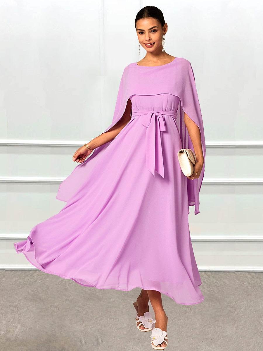 This chiffon A-line maxi dress features a refined crew neck and a stylish belted waist. With its loose fit and flowing silhouette, it's an elegant choice for summer weddings or parties, perfect for a formal yet breezy look.