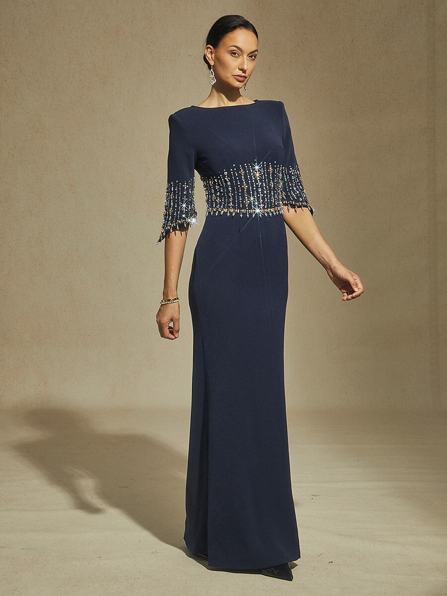Boat Neck Mermaid Evening Gown with Crystal Details