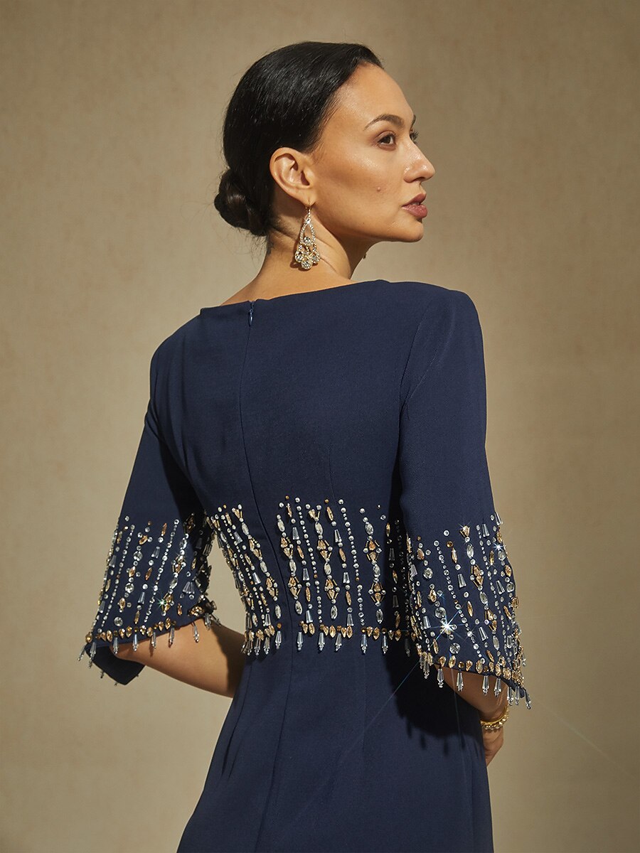 Step into timeless sophistication with this floor-length gown, styled with a refined boat neckline and elegant bell sleeves. The mermaid silhouette beautifully defines the figure, while sparkling crystal design?add a glamorous touch. Designed with structured shoulder pads, a soft lining for comfort, and a hidden back zipper, this gown ensures a graceful presence at every formal occasion.