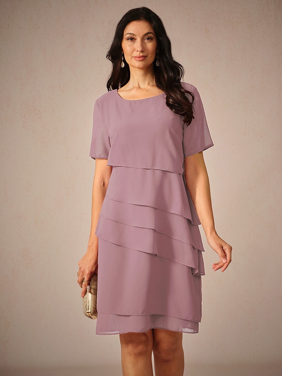 This elegant chiffon dress is perfect for a wedding guest or cocktail party. The asymmetrical hem adds a modern twist to the classic design, while the crew neckline offer a sophisticated and comfortable fit. Ideal for spring or summer occasions.