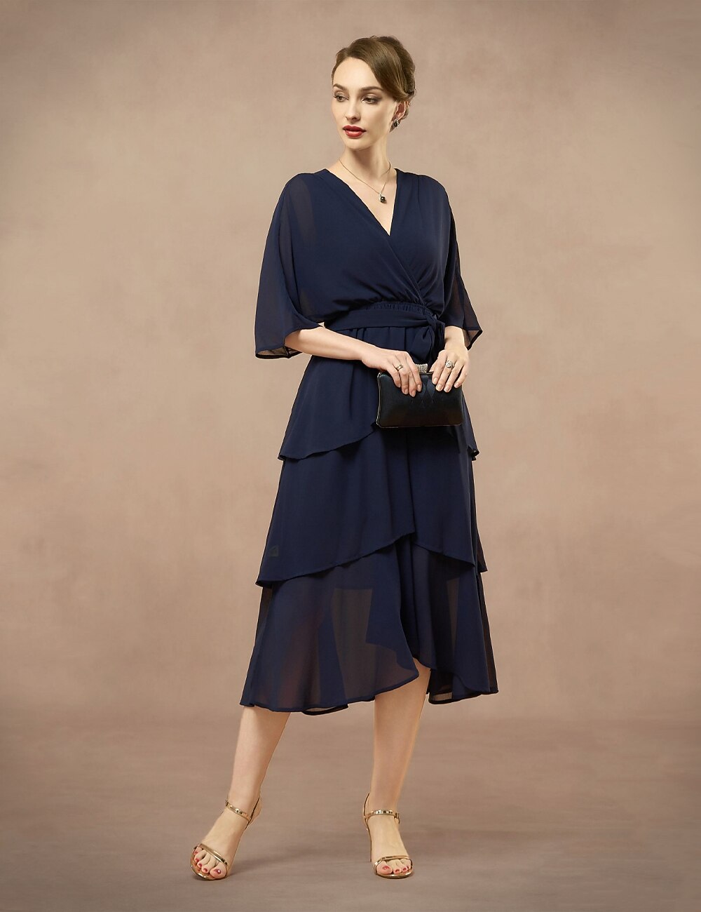 This is a women's elegant dress, featuring a V-neckline and half sleeves. The dress is designed with layered ruffles, creating a sophisticated and flowing silhouette. It is made from lightweight, breathable fabric suitable for spring and summer. The dress is perfect for weddings, cocktail parties, formal events, and evening gatherings. It comes in a deep navy blue color, offering timeless elegance. Available in a regular fit and various sizes.