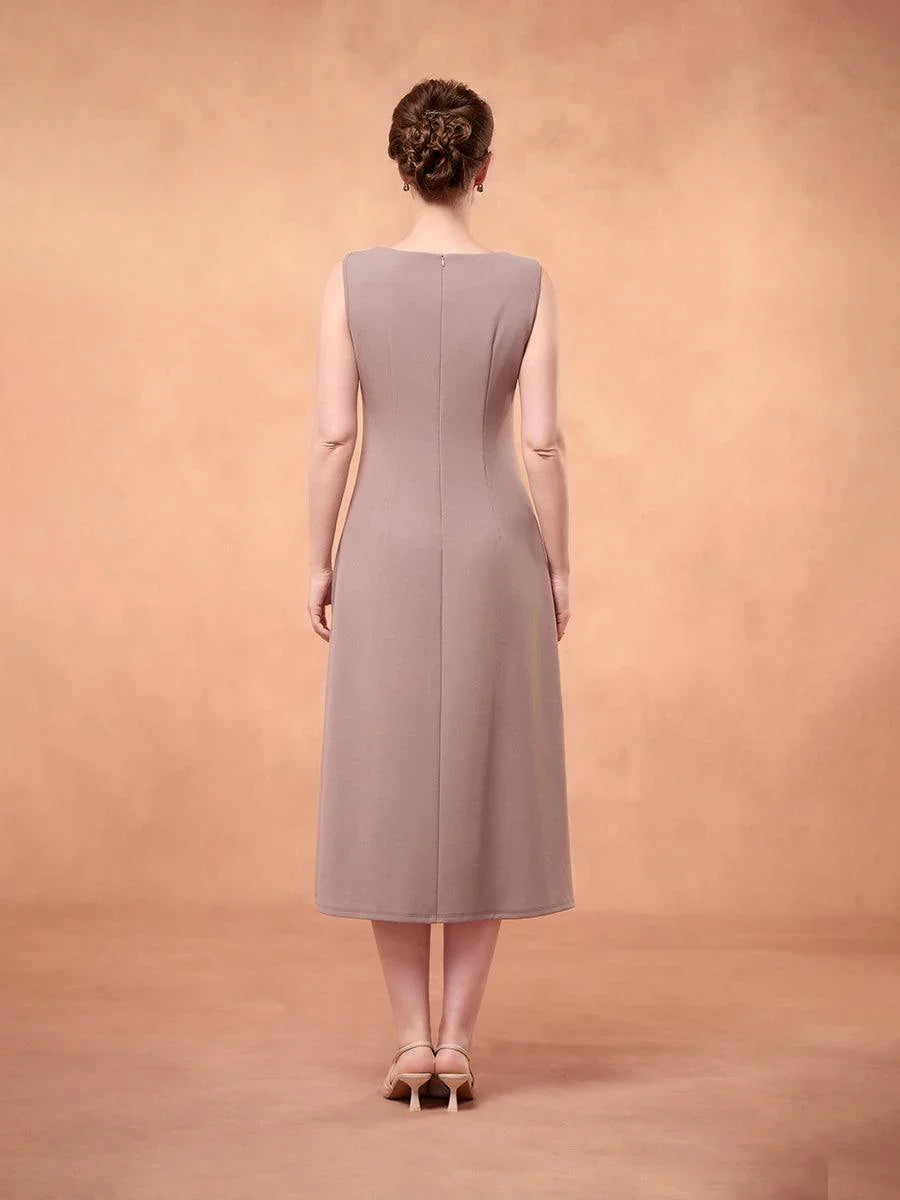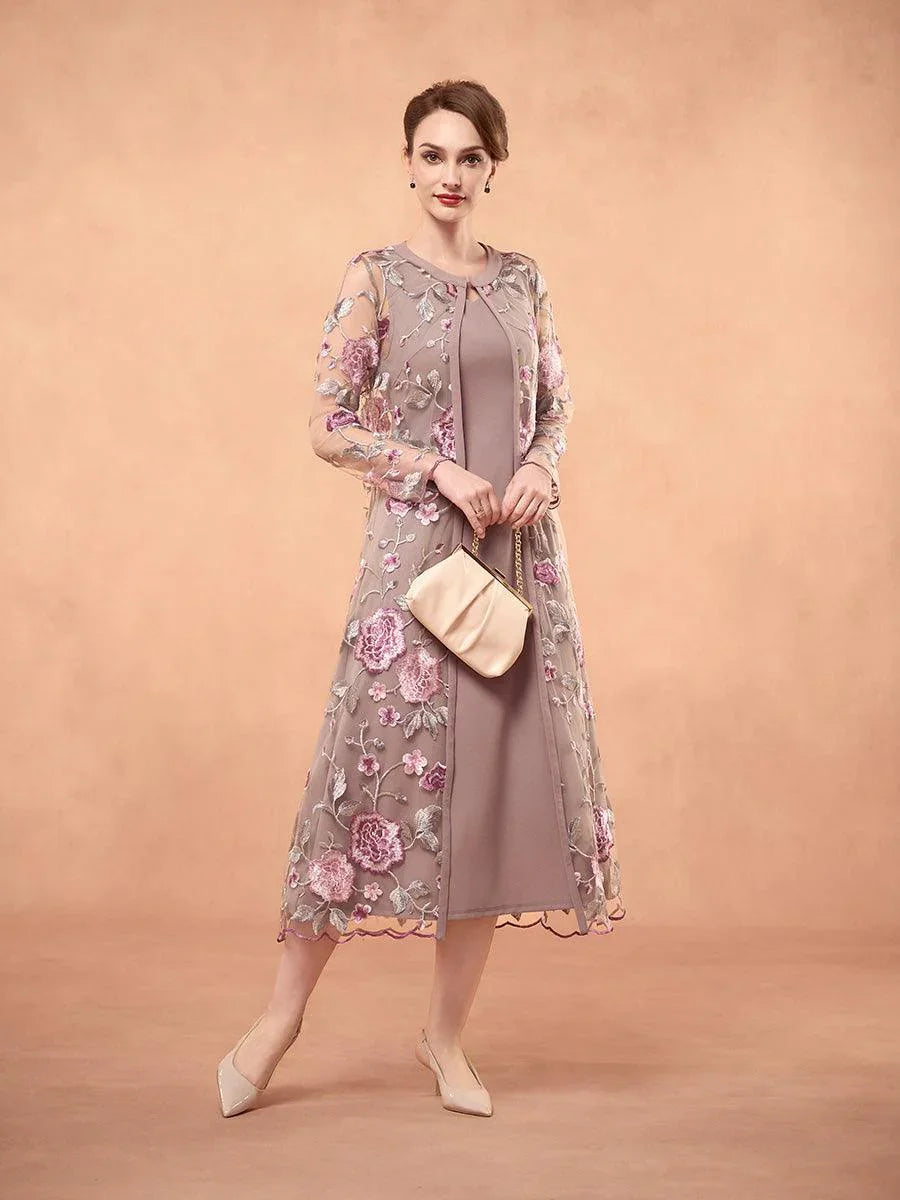 A graceful two-piece outfit featuring a sleeveless A-line dress and a matching longline jacket. The jacket showcases delicate floral cutout embroidery with scalloped cuffs and hem, while the dress is crafted from slightly stretchy, opaque fabric that falls elegantly between the knee and mid-calf. Perfectly designed for mature women who value comfort and timeless style.