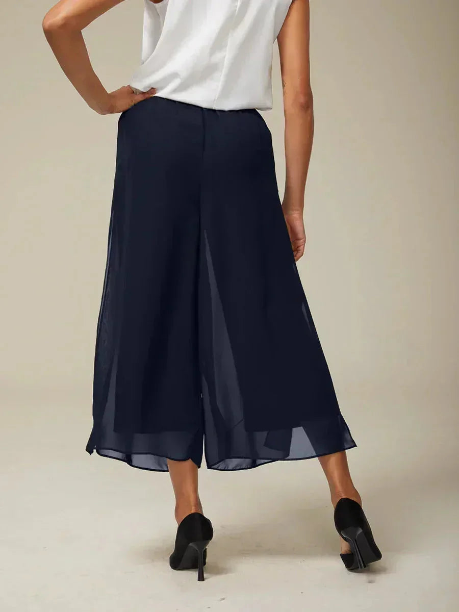 Step into effortless elegance with these cropped-length straight-leg pants featuring a flowing chiffon split-leg overlay. The mid-waist design and soft, high-stretch lining provide all-day comfort while the sheer chiffon overlay adds graceful movement and a touch of drama. Perfect for weddings, elegant dinners, banquets, or any occasion where style meets ease. Dress them up with heels or down with flats.