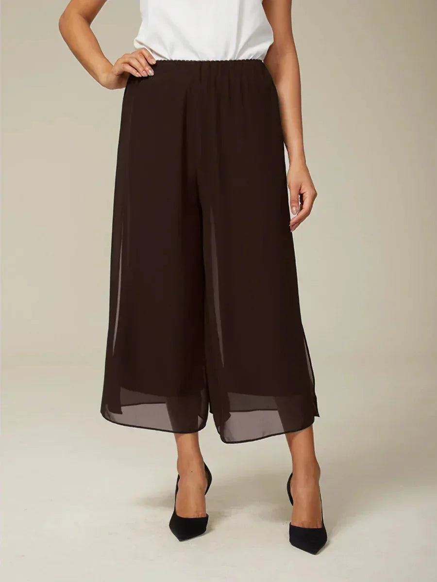 Step into effortless elegance with these cropped-length straight-leg pants featuring a flowing chiffon split-leg overlay. The mid-waist design and soft, high-stretch lining provide all-day comfort while the sheer chiffon overlay adds graceful movement and a touch of drama. Perfect for weddings, elegant dinners, banquets, or any occasion where style meets ease. Dress them up with heels or down with flats.