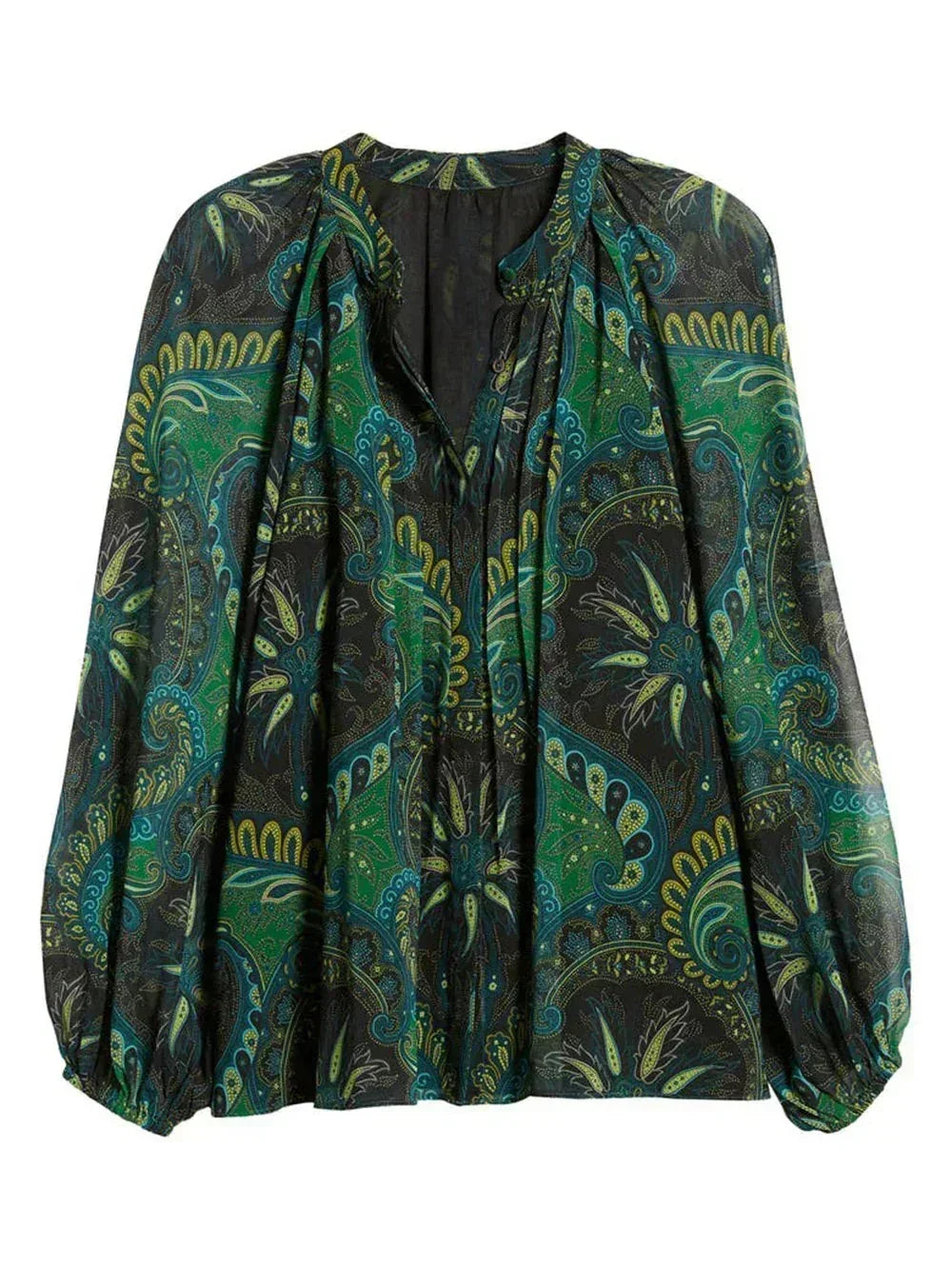 V-neck, High-low hem, Ruffle sleeves, Paisley print, 3/4 sleeves