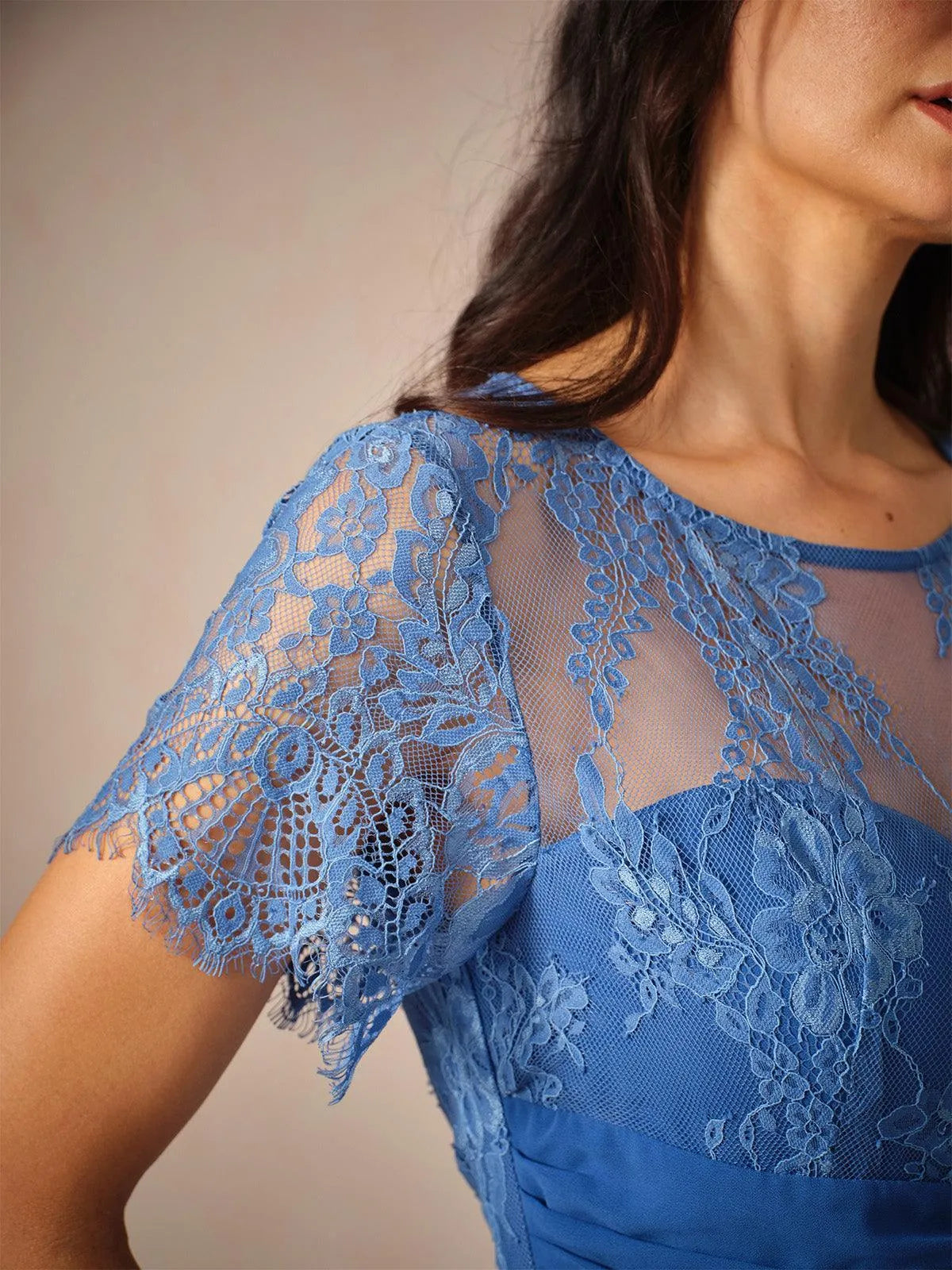 This exquisitely crafted lace-trimmed dress set blends demure sophistication with subtle allure through strategic sheer panels at the neckline and sleeves. The fine-gauge lace (reminiscent of 1940s French lingerie couture) creates delicate transparency, while eyelash edging on cuffs and hem adds couture finishing. A tiered chiffon waist sash introduces graceful movement, perfectly complementing the knee-skimming silhouette designed for discerning mature women.