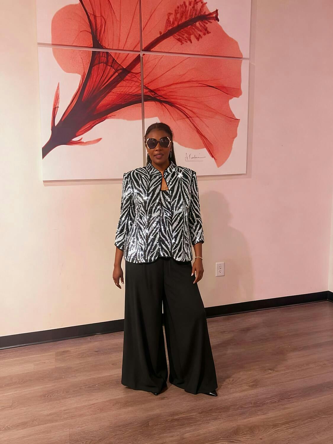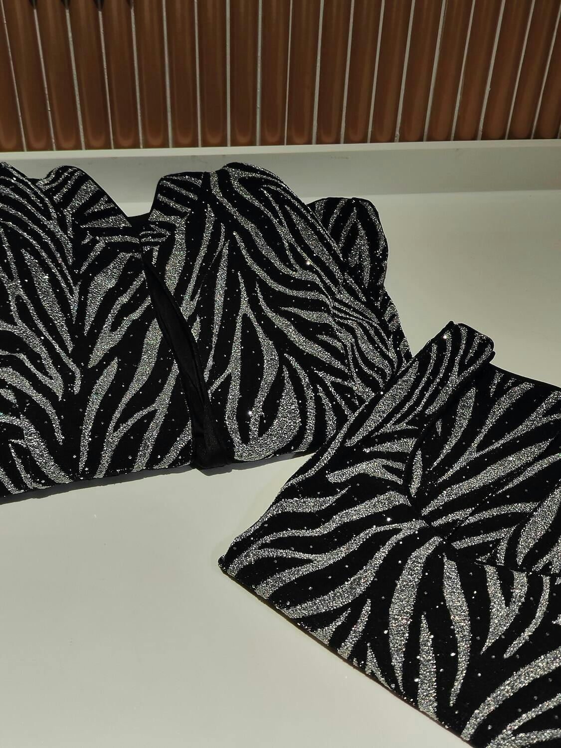 Make a striking entrance with this rhinestone-embellished twinset featuring a bold zebra-inspired pattern. Designed with a graceful mandarin collar and an elegant open-front silhouette, it sparkles with every movement, adding eye-catching glamour to your evening style. Layer it over black pants to create a polished and unforgettable look.