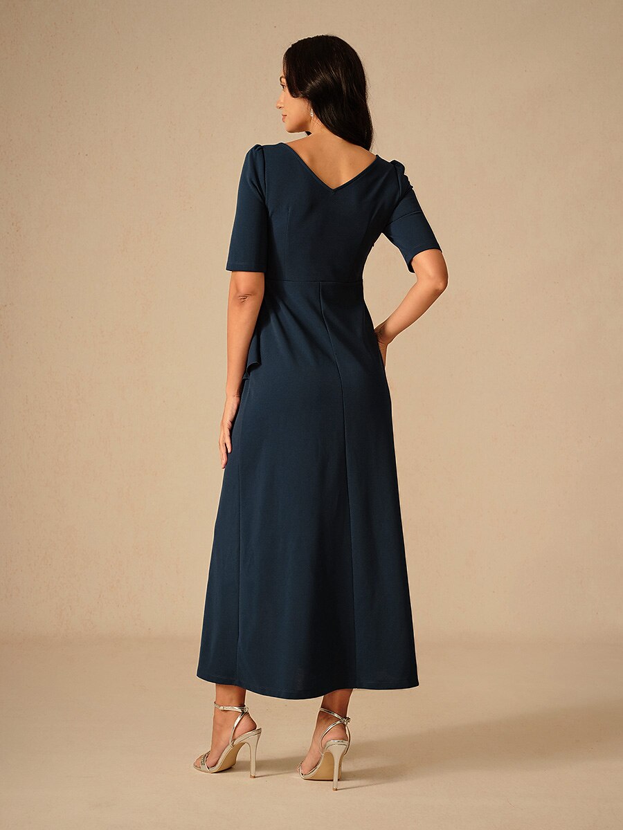 This elegant women's maxi dress features a round neckline and half sleeves with a flattering fitted waist. The front showcases an asymmetrical ruffle detail, adding movement and sophistication. Crafted from a high-quality fabric with excellent stretch and structure, this dress contours beautifully to your body, offering a flattering silhouette. Perfect for spring and summer occasions, the style adds timeless elegance to any formal event.