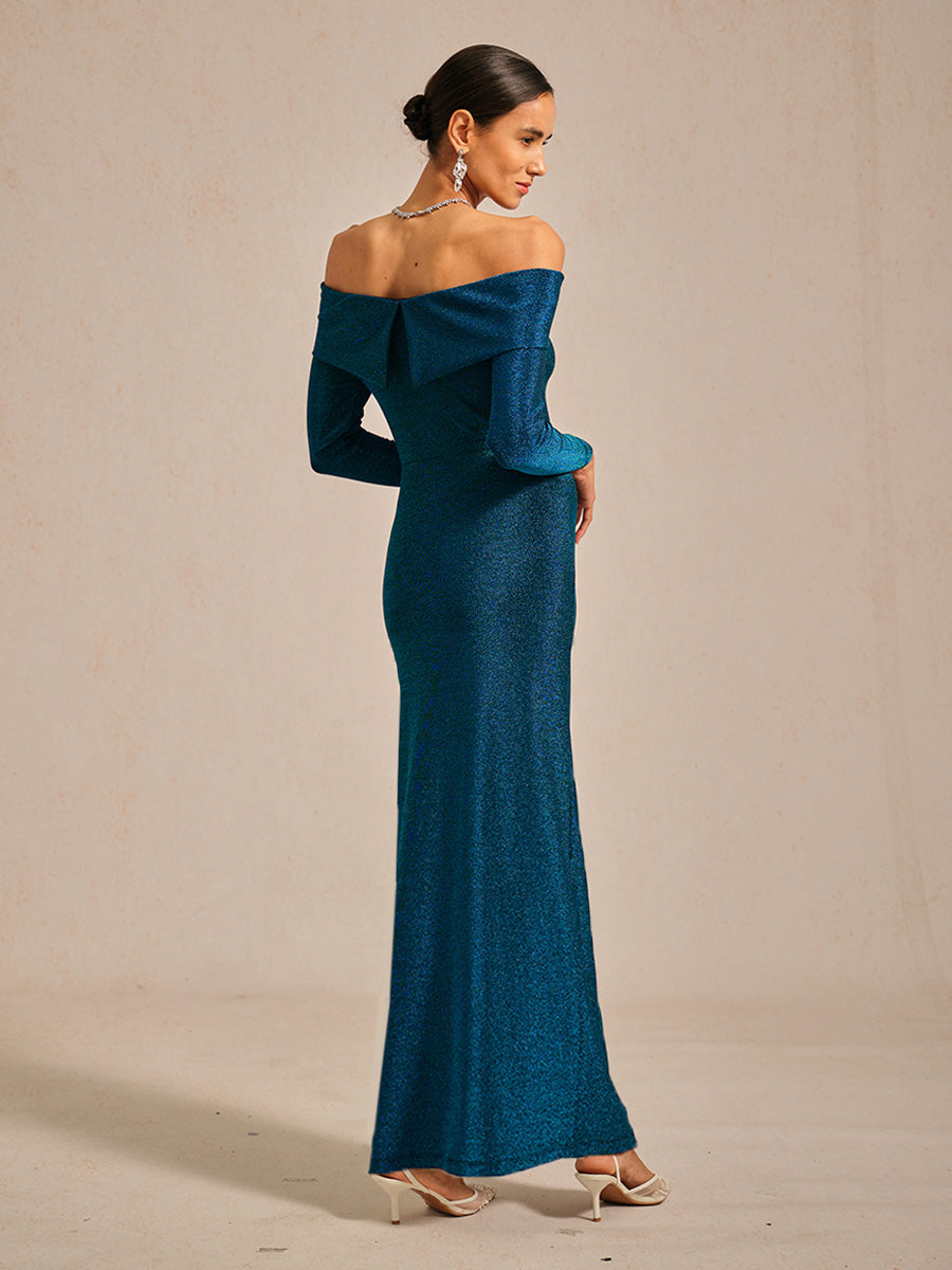 This stunning off-the-shoulder gown in a rich teal hue exudes sophistication and allure. Featuring a ruched bodice and a thigh-high slit, it creates a figure-flattering silhouette with a touch of drama. Made from a high-stretch shimmering lurex blend, the fabric offers a luxurious feel, subtle shine, and excellent flexibility for a comfortable fit. Perfect for evening occasions or formal events, this gown ensures effortless elegance with every step.