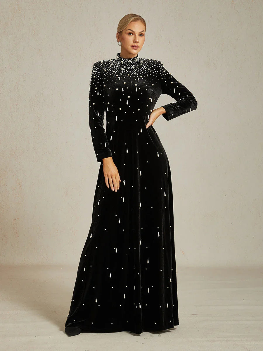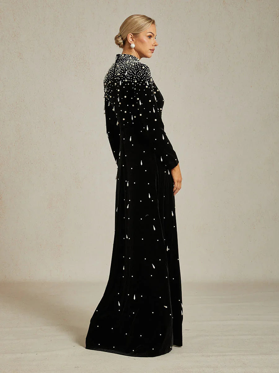 Embellished Velvet Evening Gown with Mock Neck