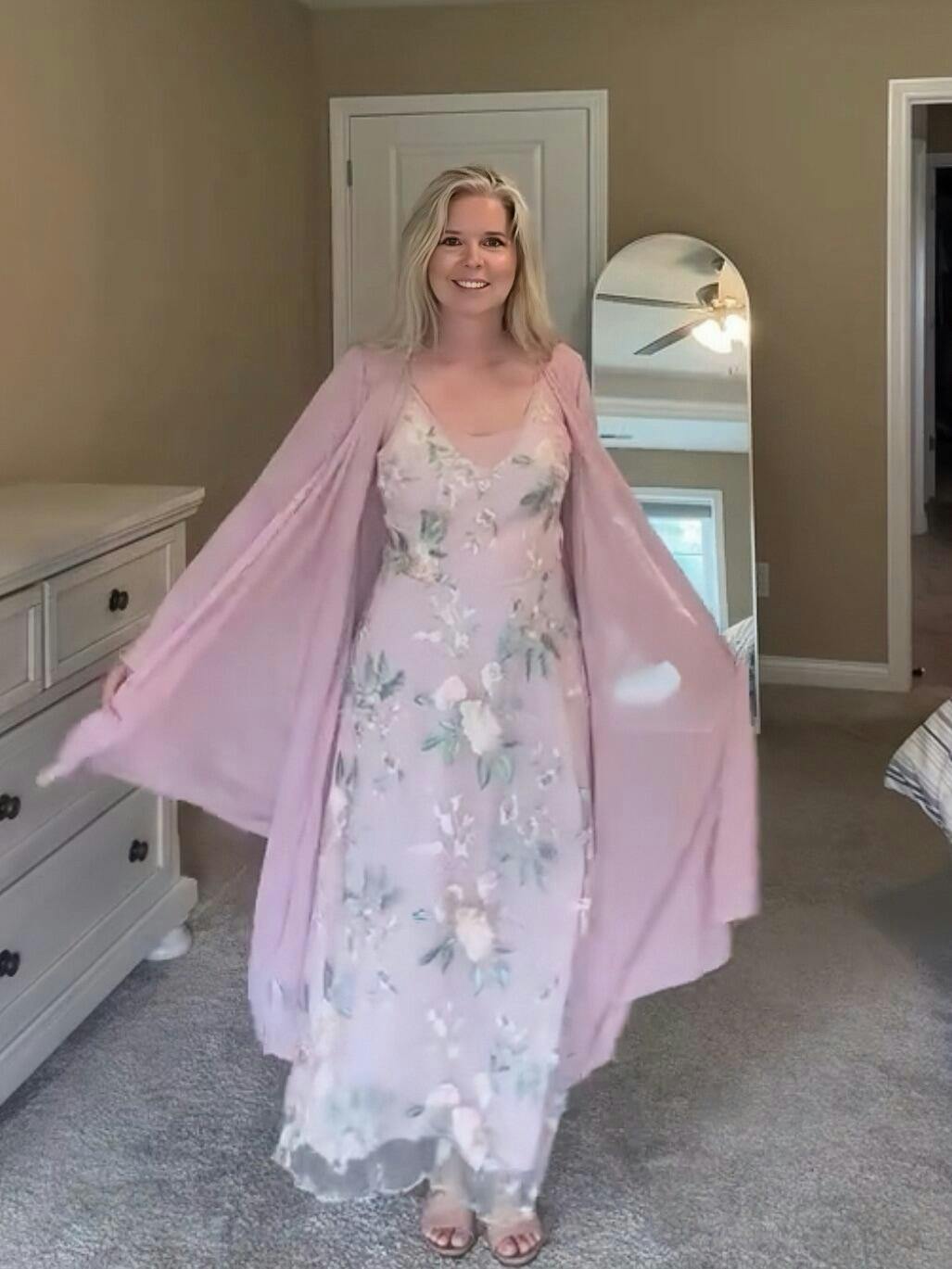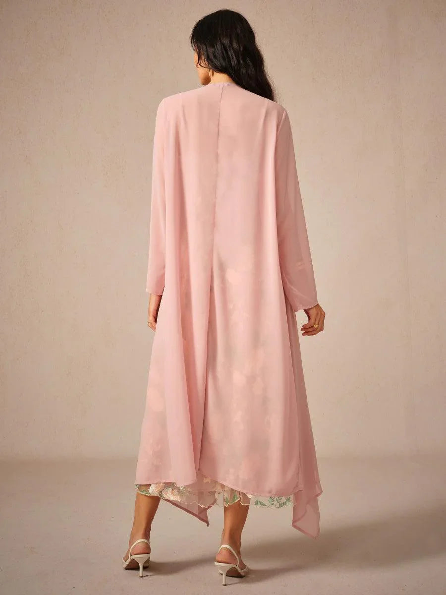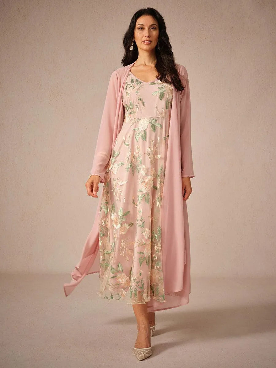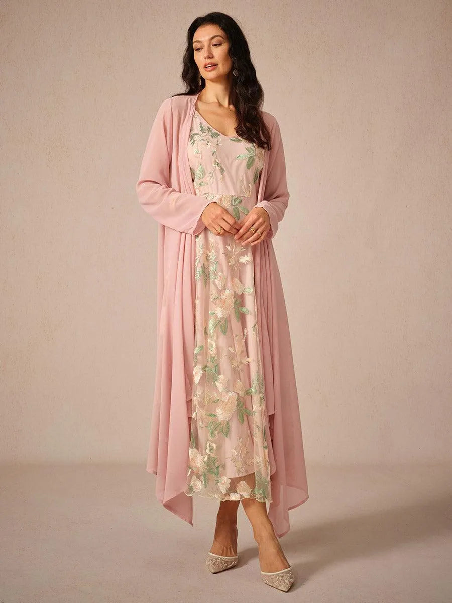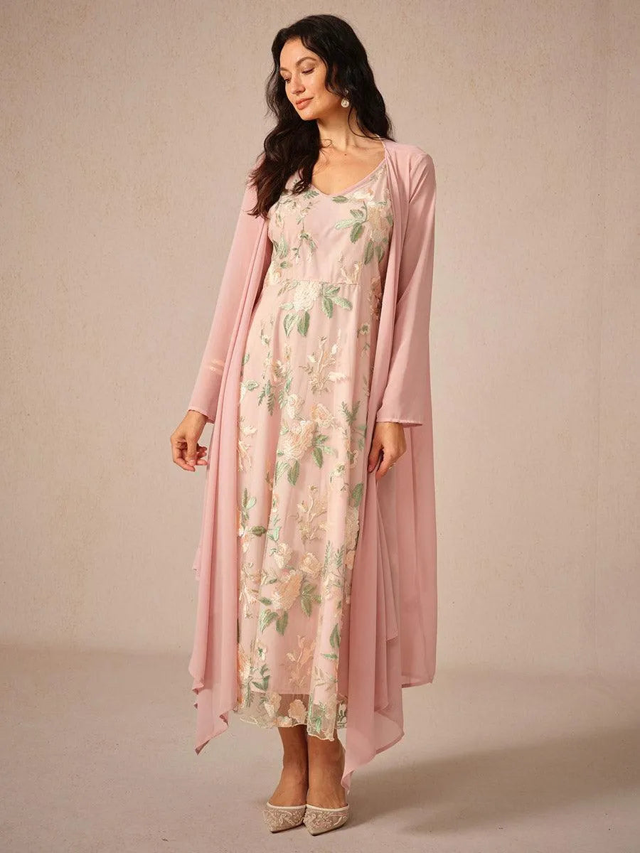 This chiffon dress set features intricate embroidered details and a flattering V-neck. The maxi length and regular fit offer elegance, making it perfect for vacations or a date night. Ideal for fall and spring, it adds a sophisticated touch to your wardrobe.