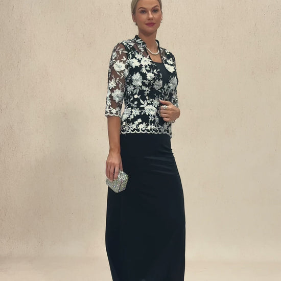 Add timeless elegance to your wardrobe with this chic twinset featuring a sheer black-and-white floral embroidered tulle jacket and a matching black knit tank. The jacket showcases a mandarin collar, scalloped cuffs and hem, and flattering three-quarter sleeves. The tank features a scoop neckline in the front and a deep round scoop at the back, offering feminine contrast and layered comfort. A sophisticated pairing for semi-formal events or elevated daily wear.