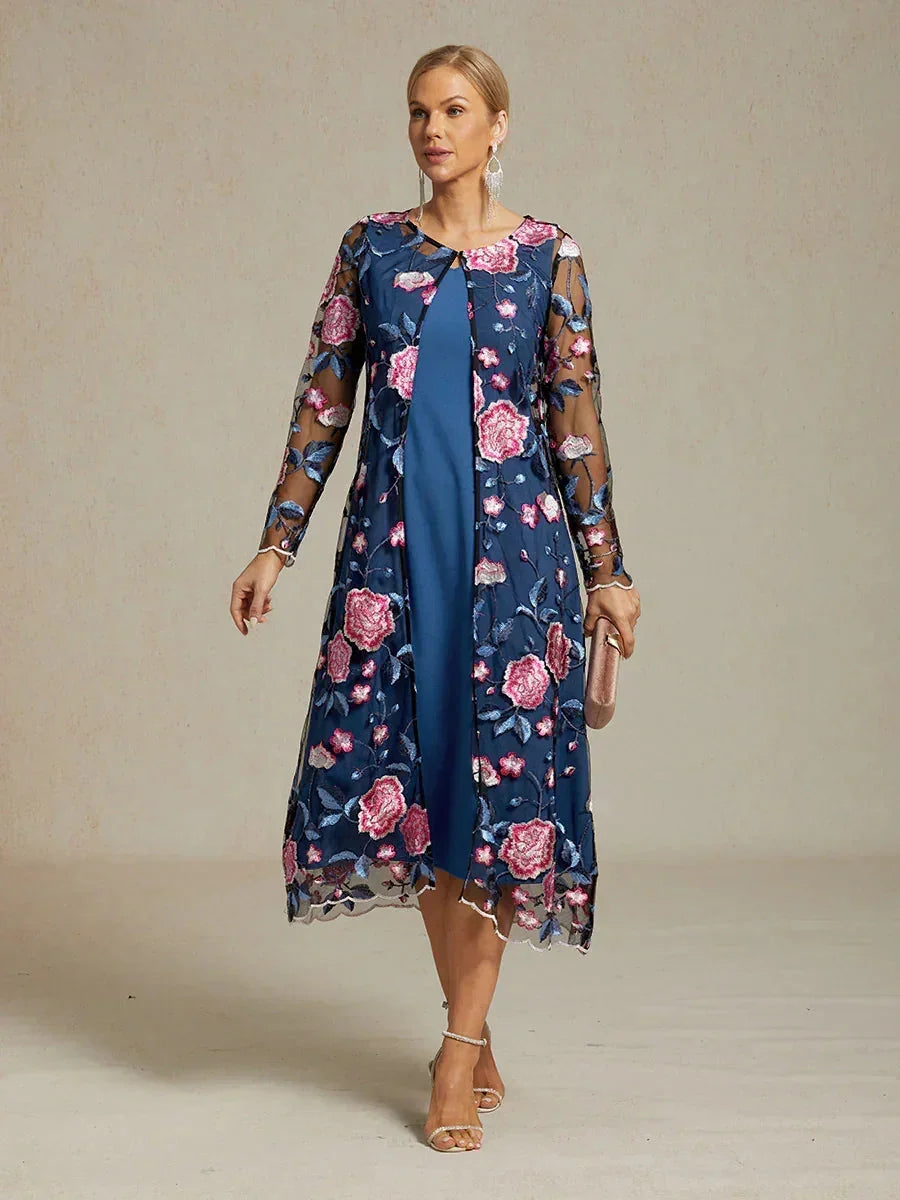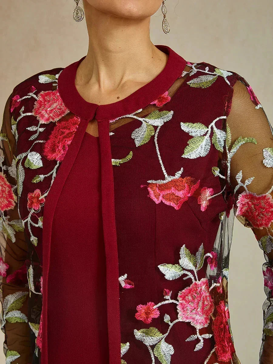 This longline mesh jacket features intricate floral embroidery and a classic round neckline, offering a touch of elegance and femininity. Its sheer design pairs beautifully with a simple inner dress, making it a versatile piece for layering. The lightweight, breathable mesh fabric is perfect for adding refinement without bulk, ideal for mature women seeking graceful, layered looks.