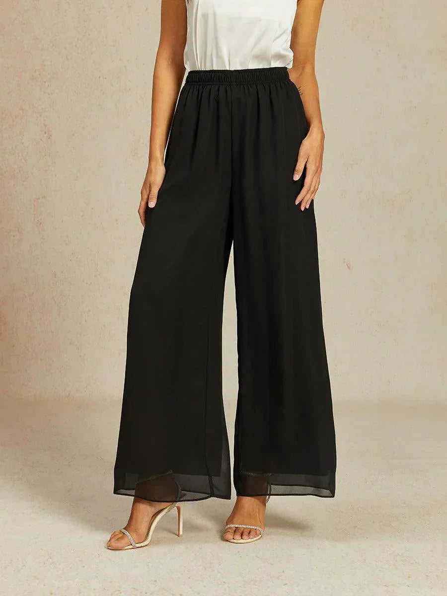 These women's wide-leg pants are crafted from lightweight chiffon, offering breathability and a soft drape for a graceful silhouette. The mid-rise design with an elastic waistband ensures a comfortable and flexible fit. Designed for both elegance and ease, these flowy trousers are perfect for various occasions, from casual outings to semi-formal settings.