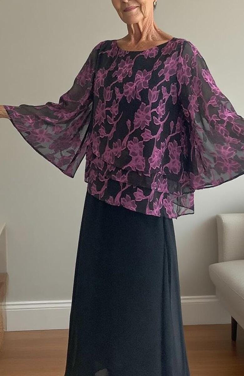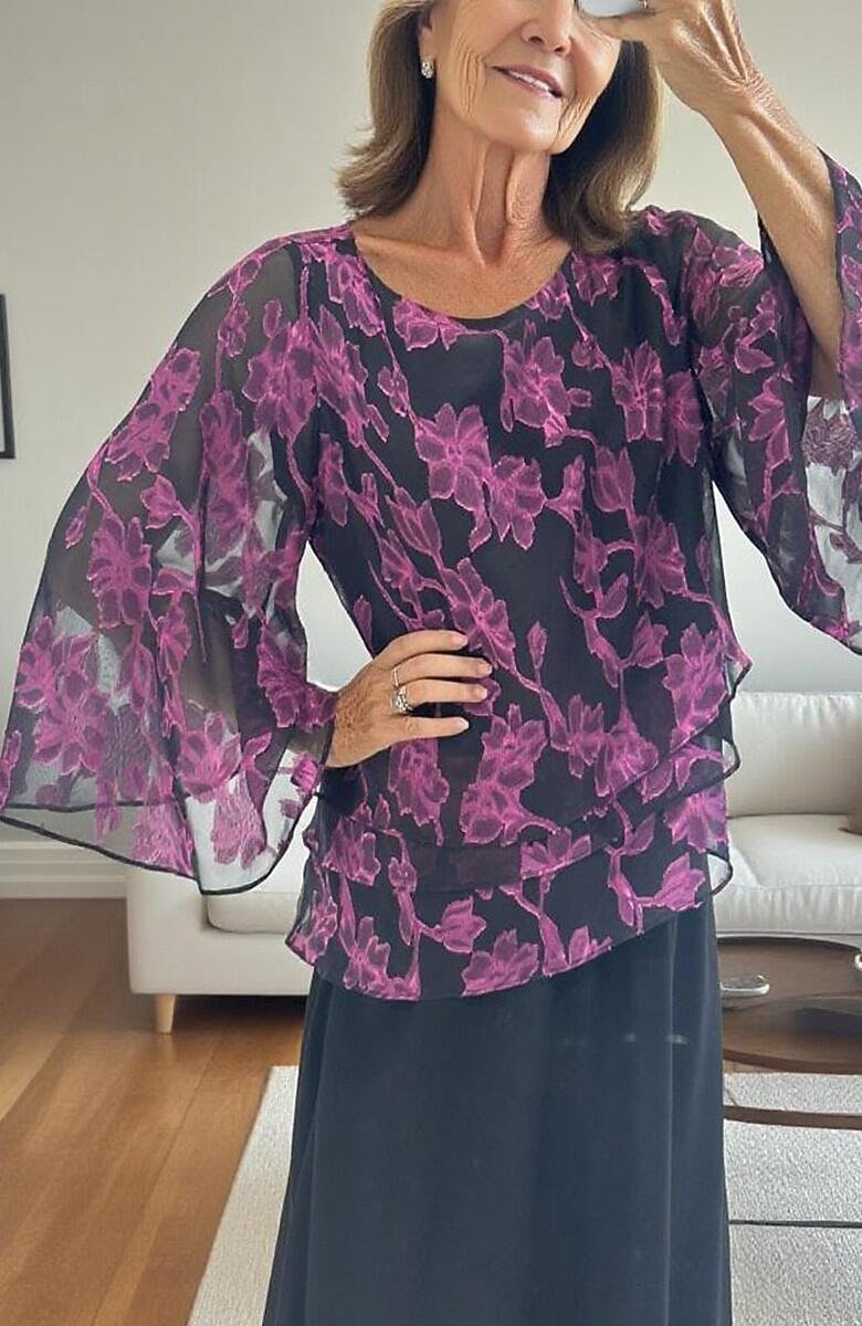 Floral Chiffon Boat Neck Blouse with A-Line Sleeves