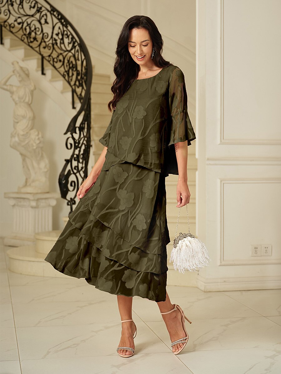 Features layered sheer fabric and a soft floral print. The A-line cut ensures graceful drape and ease of movement.