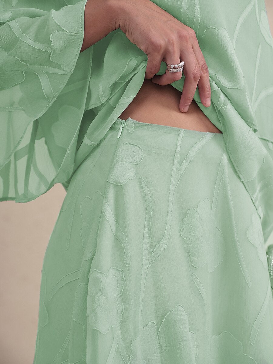 This elegant midi skirt features a layered chiffon design with a soft floral pattern. The dark navy color adds sophistication, while the A-line silhouette offers a flattering and comfortable fit. Sheer chiffon layers give it a graceful, airy look, perfect for semi-formal events. The skirt is non-adjustable at the waist and crafted from lightweight, breathable fabric that flows beautifully with movement.
