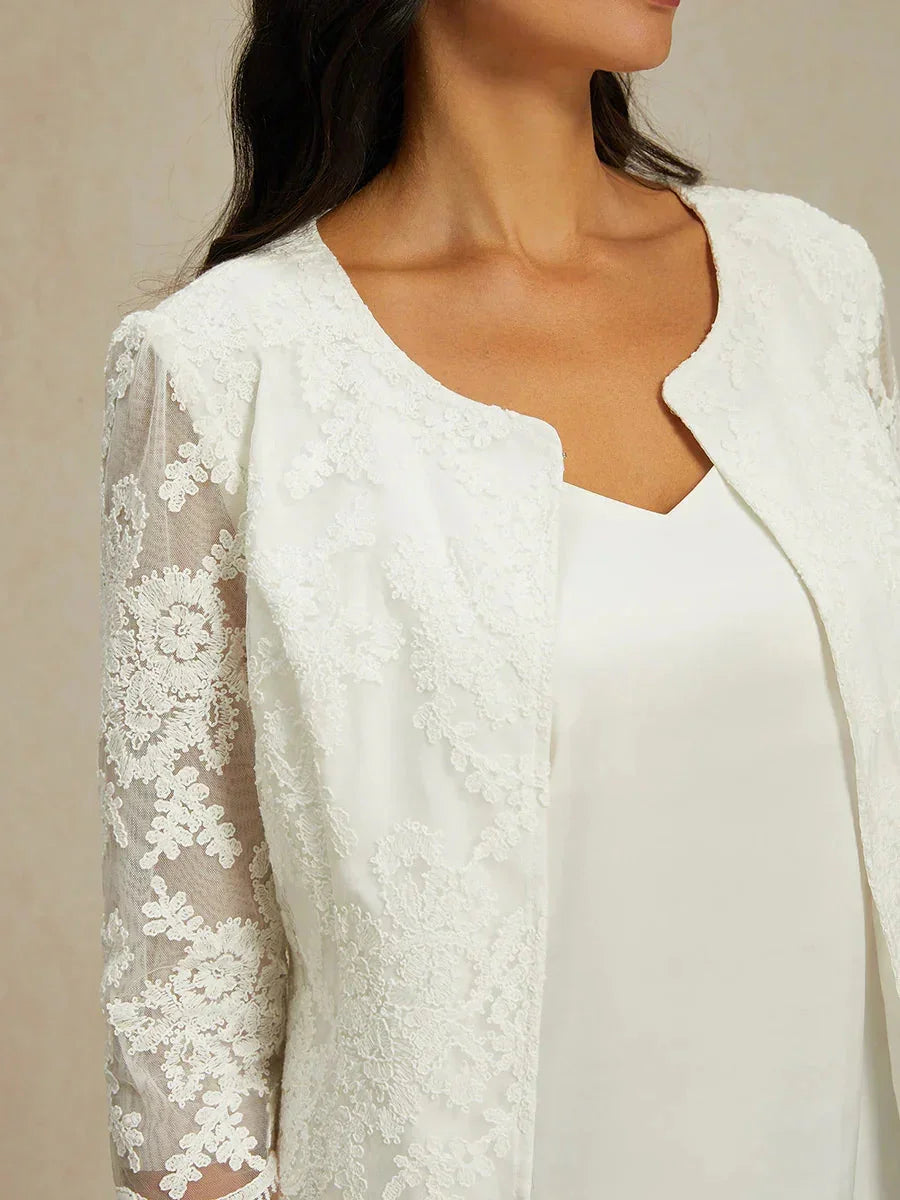 This elegant embroidered lace jacket is designed with an open front and flattering 3/4 sleeves, offering a lightweight layer of sophistication. The sheer floral lace adds a delicate charm, making it the perfect piece to pair with dresses or separates for weddings, evening events, or special celebrations.