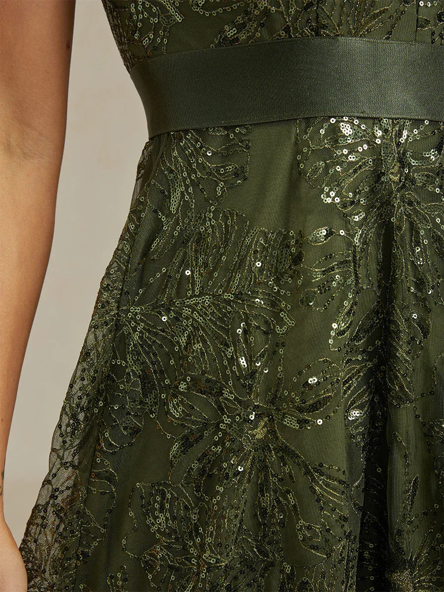 Sleeveless Glitter Lace Satin A-Line Dress with Silver Glitter