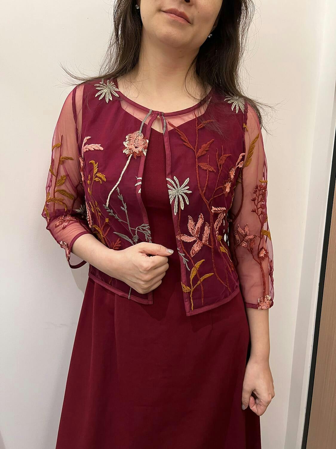 This floral burnout chiffon short shrug is the perfect layering piece to complement any formal dress. The lightweight and sheer fabric provides a delicate touch, while the elegant design enhances your overall outfit. Ideal for adding a touch of sophistication to your ensemble, this cardigan is perfect for evening events, formal gatherings, or any occasion where you want to feel chic and stylish.