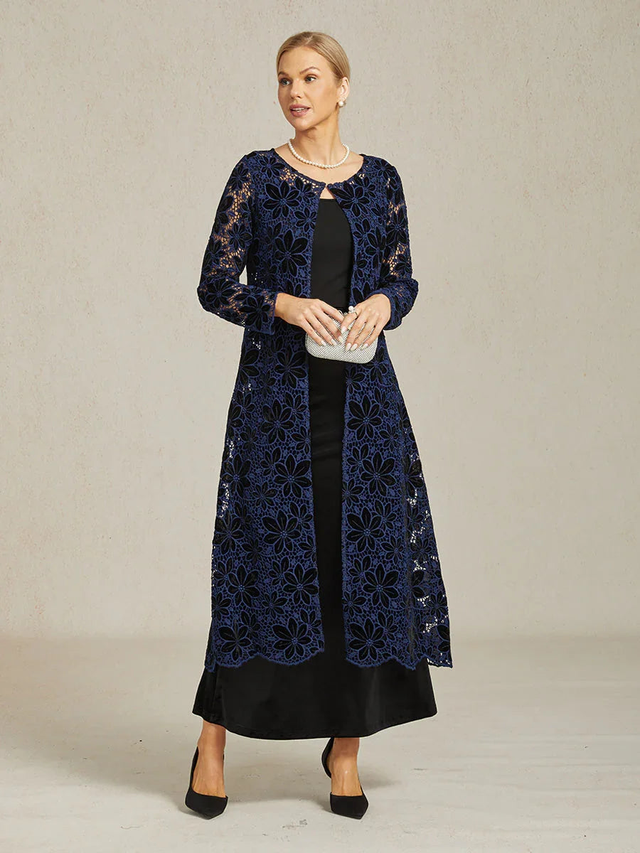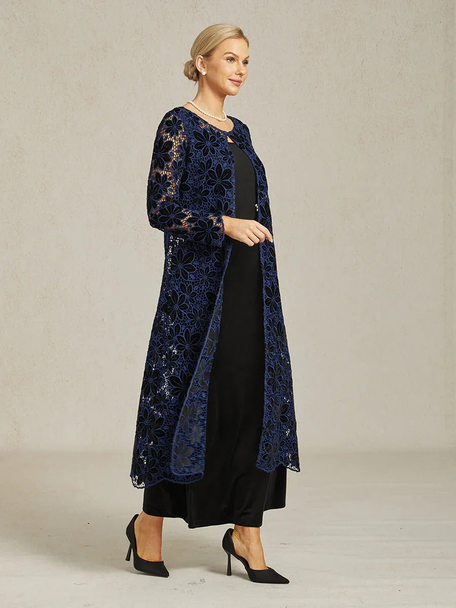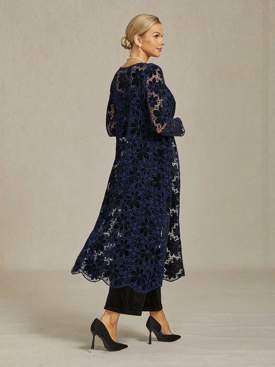 Design: Longline length to mid-calf, open front, full-length sleeves, floral embroidery, easy layering